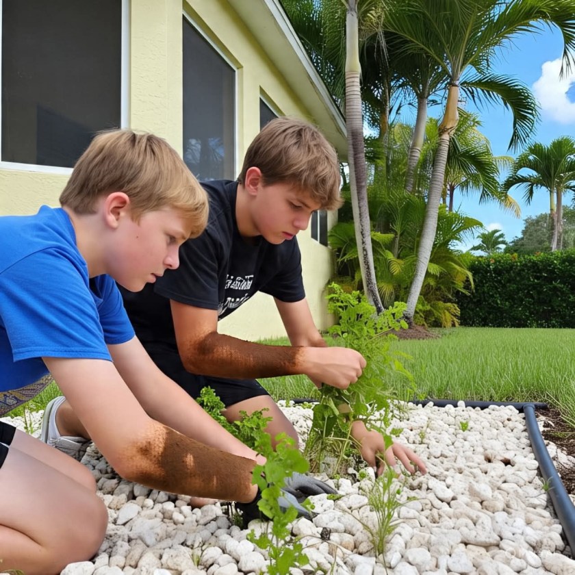 The front of our house was landscaped from one end to the other with ornamental flint rocks. Trees and shrubs were planted here and there among the rocks, but weeds were popping up everywhere. Pop handed us each a bucket, then pointed. “OK,” he said. “Get going.”